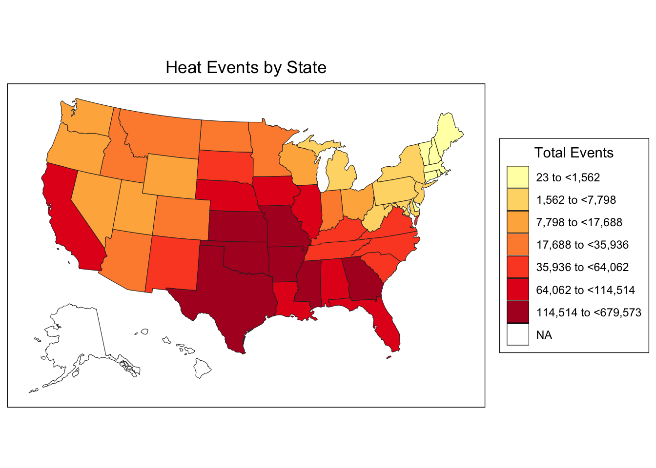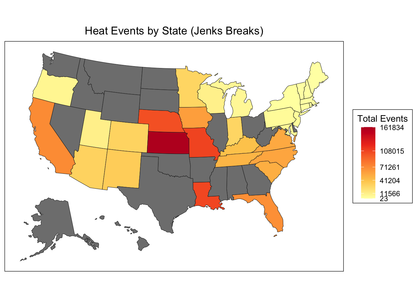 # Use the breaks in choroplethrstate_choropleth(heat_by_state,title ="Heat Events by State (Jenks Breaks)",legend ="Total Events",num_colors =1) +scale_fill_gradientn(colors = RColorBrewer::brewer.pal(5, "YlOrRd"),breaks = jenks_breaks$brks,labels =round(jenks_breaks$brks))