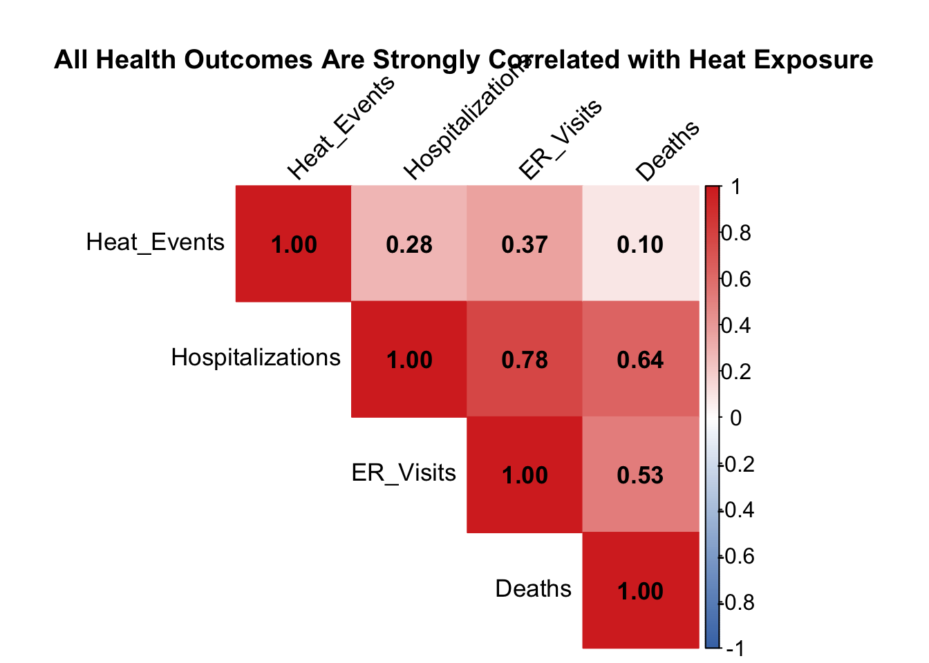 The correlation matrix reveals a surprising pattern. While all three health outcomes show positive correlations with heat events, the relationships are surprisingly weak: hospitalizations (0.28), ER visits (0.37), and deaths (0.10). This confirms what we’ve seen throughout our analysis—heat exposure alone is a poor predictor of health impacts.
