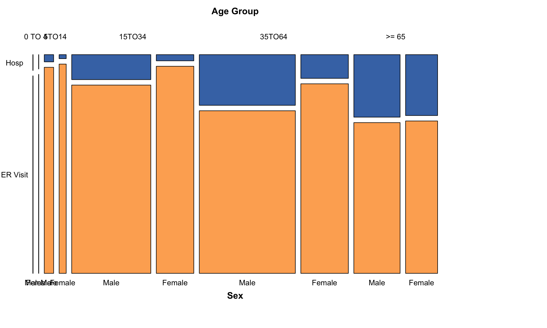 Our mosaic plot reveals that while all age groups are affected, the proportion of severe outcomes (hospitalizations vs. ER visits) increases dramatically with age. The blue bands—representing hospitalizations—dominate the older age groups. The key finding is age is a critical risk factor. Older Americans are most vulnerable to severe heat-related illness.