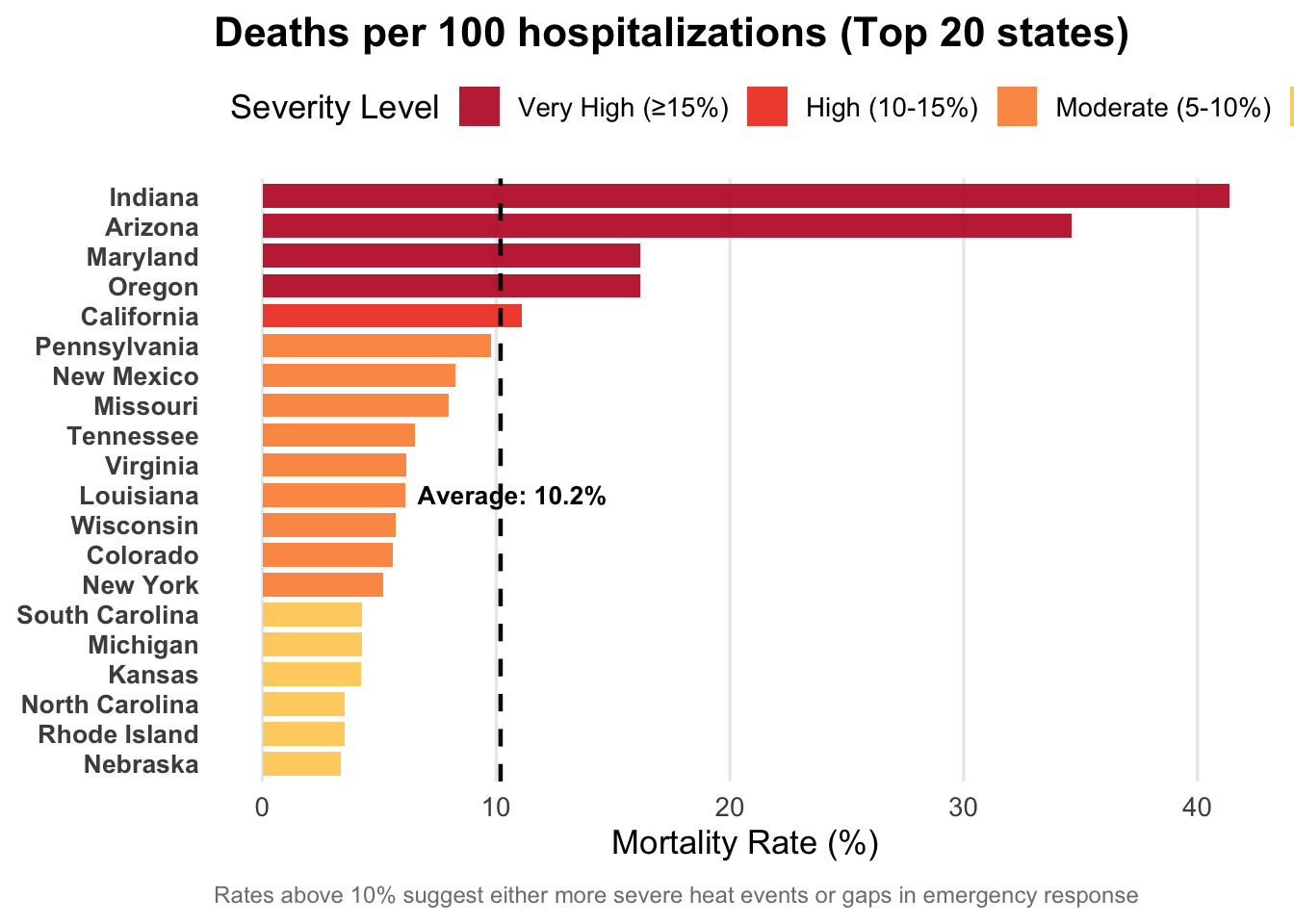 # Calculate mortality ratesmortality_rate <- hosp |>group_by(State) |>summarise(hospitalizations =sum(Hosps, na.rm =TRUE)) |>left_join( deaths |>group_by(State) |>summarise(deaths =sum(as.numeric(Deaths), na.rm =TRUE)),by ="State" ) |>mutate(mortality_rate = (deaths / hospitalizations) *100) |>filter(!is.na(mortality_rate), mortality_rate >0) |>arrange(desc(mortality_rate)) |>slice_head(n =20) |>mutate(rate_category =case_when( mortality_rate >=15~"Very High (≥15%)", mortality_rate >=10~"High (10-15%)", mortality_rate >=5~"Moderate (5-10%)",TRUE~"Lower (<5%)" ),rate_category =factor(rate_category, levels =c("Very High (≥15%)", "High (10-15%)", "Moderate (5-10%)", "Lower (<5%)")) )# Calculate average for reference lineavg_rate <-mean(mortality_rate$mortality_rate)ggplot(mortality_rate, aes(x =reorder(State, mortality_rate), y = mortality_rate, fill = rate_category)) +geom_col(alpha =0.9, width =0.8) +geom_hline(yintercept = avg_rate, linetype ="dashed", color ="black", linewidth =0.8) +annotate("text", x =10, y = avg_rate +0.5, label =sprintf("Average: %.1f%%", avg_rate),color ="black", size =3.5, fontface ="bold") +coord_flip() +scale_fill_manual(values =c("Very High (≥15%)"="#bd0026","High (10-15%)"="#f03b20","Moderate (5-10%)"="#fd8d3c","Lower (<5%)"="#fecc5c") ) +labs(title ="Deaths per 100 hospitalizations (Top 20 states)",x =NULL, y ="Mortality Rate (%)",fill ="Severity Level",caption ="Rates above 10% suggest either more severe heat events or gaps in emergency response" ) +theme_minimal(base_size =13) +theme(plot.title =element_text(face ="bold", size =16, hjust =0, margin =margin(b =5)),plot.subtitle =element_text(size =11, hjust =0, color ="gray30", margin =margin(b =10)),axis.text.y =element_text(size =10, face ="bold"),legend.position ="top",legend.justification ="left",panel.grid.major.y =element_blank(),panel.grid.minor =element_blank(),plot.caption =element_text(size =9, color ="gray50", hjust =0, margin =margin(t =10)) )