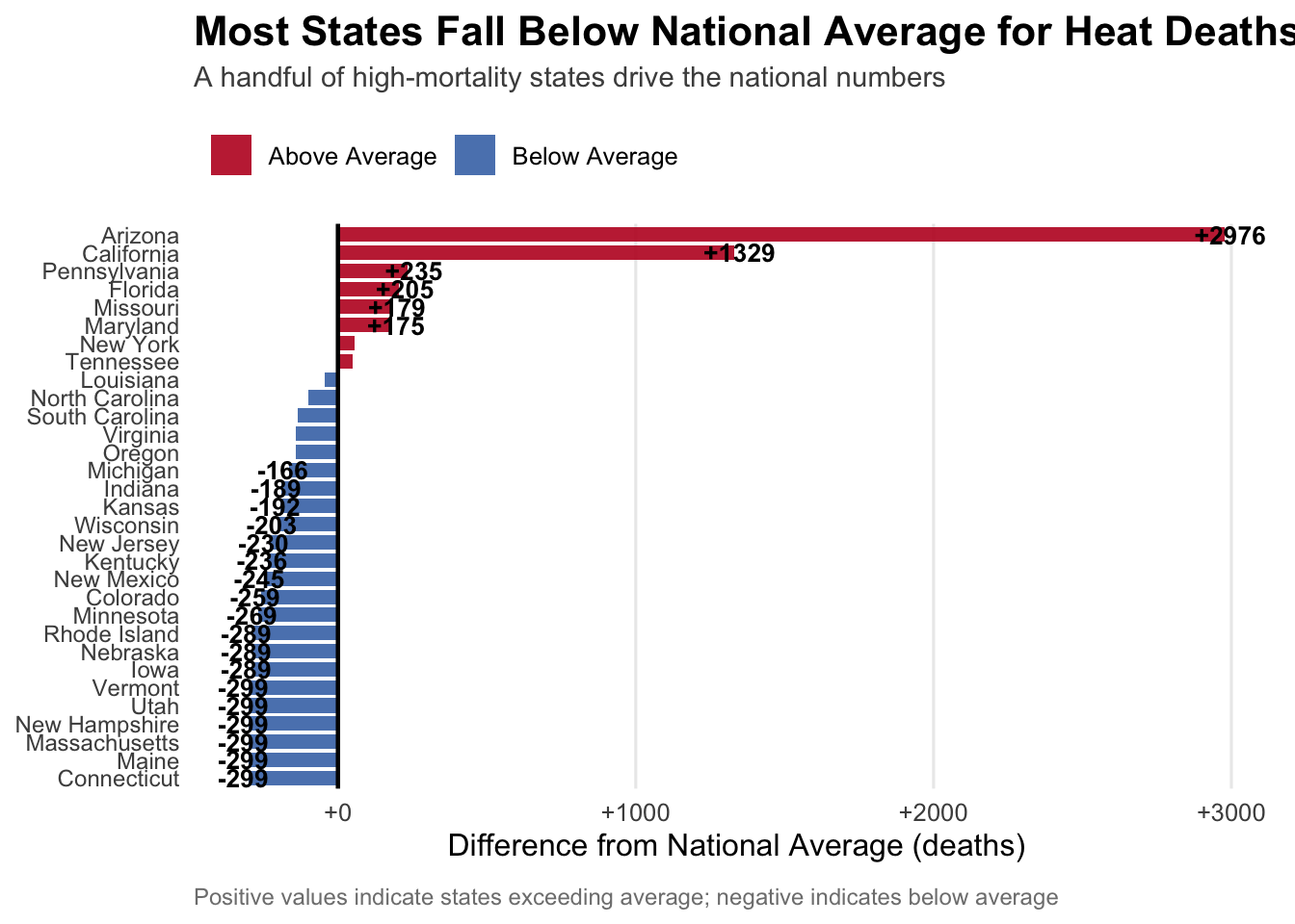 This graph shows which states are the main drivers of the absolute number of heat-related deaths by measuring the difference from the national average.