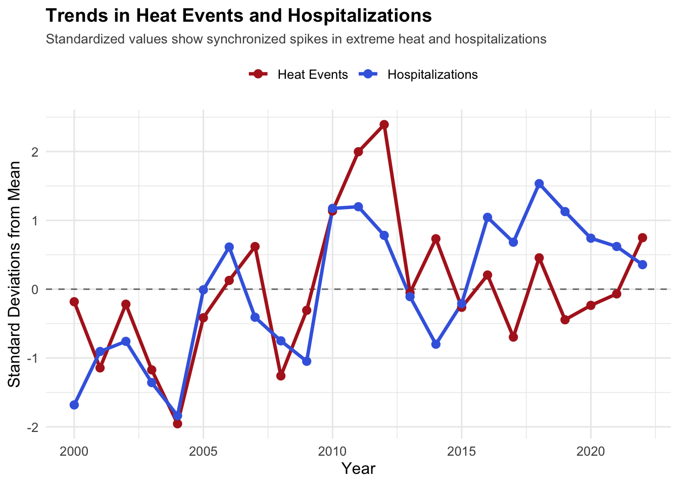 # Create combined dataset with annual aggregatescombined <- heat_events |>group_by(Year) |>summarise(heat_events =sum(EHE, na.rm =TRUE)) |>left_join( hosp |>group_by(Year) |>summarise(hospitalizations =sum(Hosps, na.rm =TRUE)),by ="Year" )combined_standardized <- combined |>mutate(heat_z =scale(heat_events)[,1],hosp_z =scale(hospitalizations)[,1] ) |>pivot_longer(cols =c(heat_z, hosp_z),names_to ="Metric",values_to ="Standardized_Value")ggplot(combined_standardized, aes(x = Year, y = Standardized_Value, color = Metric)) +geom_hline(yintercept =0, linetype ="dashed", color ="gray50") +geom_line(linewidth =1.2) +geom_point(size =2.5) +scale_color_manual(values =c("heat_z"="firebrick", "hosp_z"="royalblue"),labels =c("Heat Events", "Hospitalizations") ) +labs(title ="Trends in Heat Events and Hospitalizations",subtitle ="Standardized values show synchronized spikes in extreme heat and hospitalizations",x ="Year",y ="Standard Deviations from Mean",color ="" ) +theme_minimal(base_size =12) +theme(plot.title =element_text(face ="bold", size =14),plot.subtitle =element_text(size =10, color ="gray30", hjust =0),legend.position ="top" )