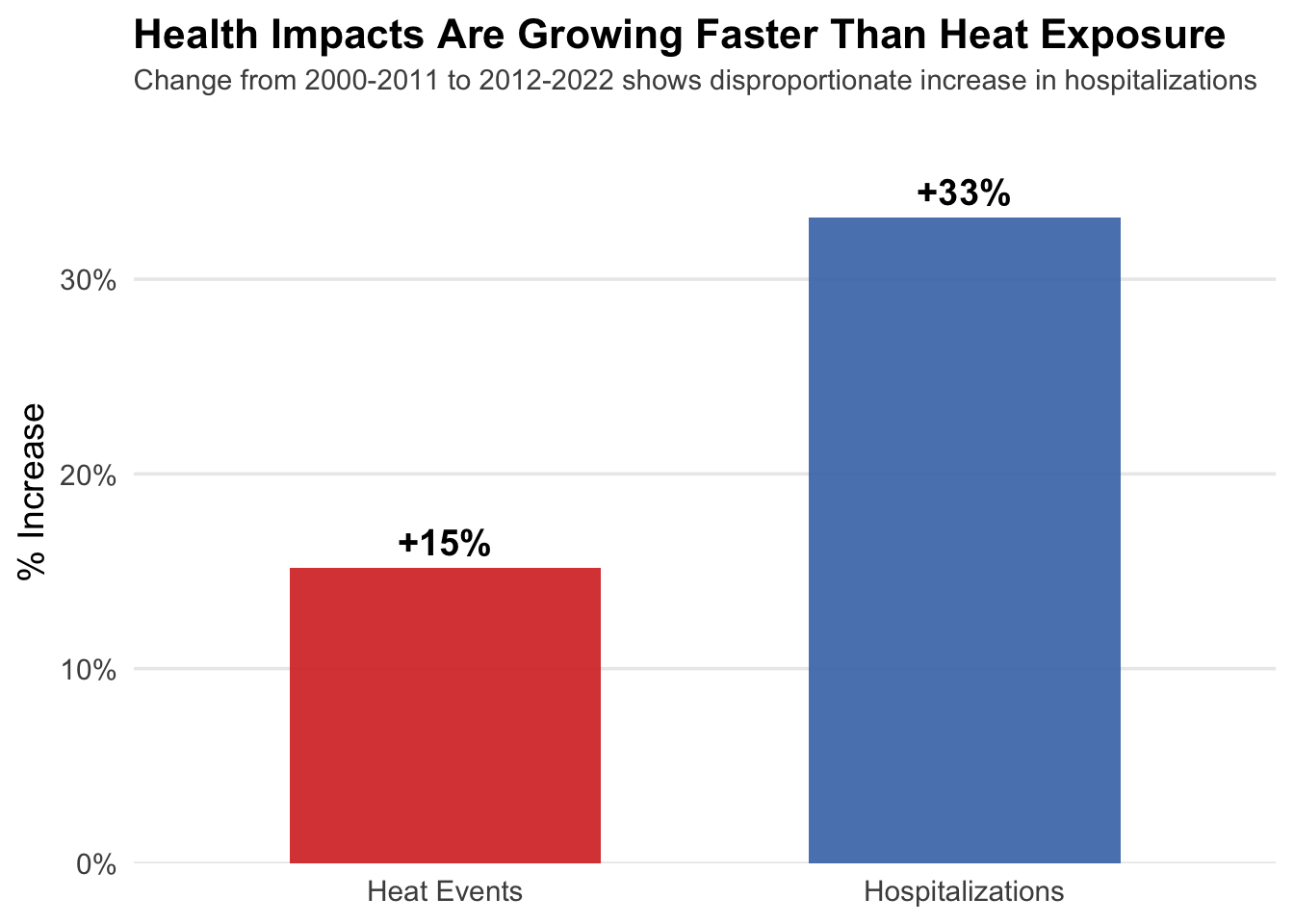 # Calculate period averages for two equal periodsperiod_summary <- combined |>mutate(period =case_when( Year <=2011~"2000-2011",TRUE~"2012-2022" )) |>group_by(period) |>summarise(avg_heat =mean(heat_events),avg_hosp =mean(hospitalizations) ) |>mutate(heat_pct_change = (avg_heat /lag(avg_heat) -1) *100,hosp_pct_change = (avg_hosp /lag(avg_hosp) -1) *100 )# Reshape for plotting - only second period (which has the % changes)period_long <- period_summary |>filter(!is.na(heat_pct_change)) |># Only keep row with calculated changesselect(period, heat_pct_change, hosp_pct_change) |>pivot_longer(cols =c(heat_pct_change, hosp_pct_change),names_to ="metric",values_to ="pct_change") |>mutate(metric =factor(metric, levels =c("heat_pct_change", "hosp_pct_change"),labels =c("Heat Events", "Hospitalizations")))ggplot(period_long, aes(x = metric, y = pct_change, fill = metric)) +geom_col(width =0.6, alpha =0.9) +geom_text(aes(label =sprintf("+%.0f%%", pct_change)), vjust =-0.5, size =5, fontface ="bold") +scale_fill_manual(values =c("Heat Events"="#d73027", "Hospitalizations"="#4575b4"),guide ="none") +scale_y_continuous(labels =function(x) paste0(x, "%"), limits =c(0, max(period_long$pct_change) *1.15),expand =c(0, 0)) +labs(title ="Health Impacts Are Growing Faster Than Heat Exposure",subtitle ="Change from 2000-2011 to 2012-2022 shows disproportionate increase in hospitalizations",x =NULL, y ="% Increase" ) +theme_minimal(base_size =14) +theme(plot.title =element_text(face ="bold", size =16, margin =margin(b =5), hjust =0),plot.subtitle =element_text(size =11, hjust =0, color ="gray30", margin =margin(b =10)),panel.grid.major.x =element_blank(),panel.grid.minor =element_blank() )