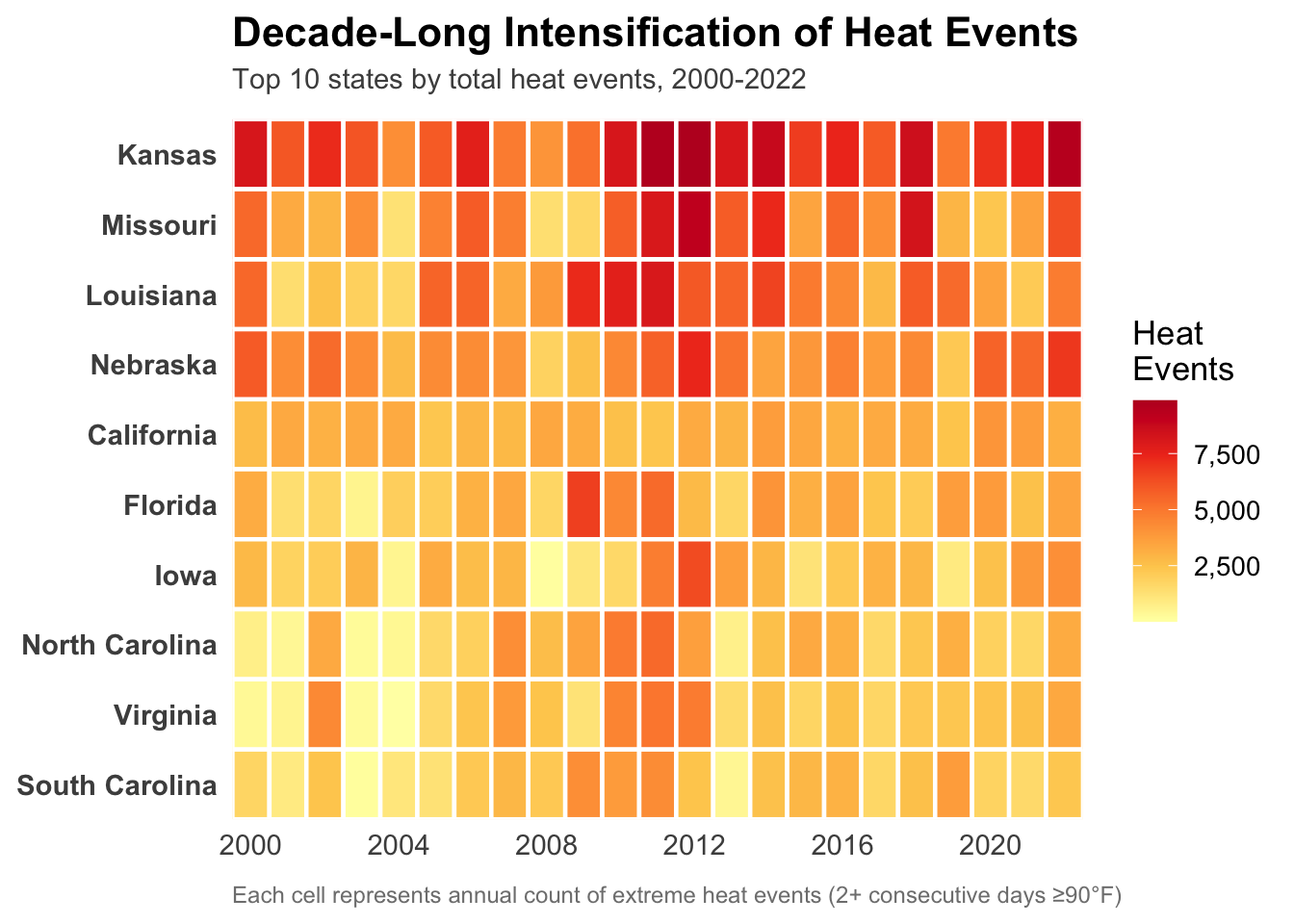 Kansas clearly has it the worst, showing up as dark red almost every single year. The most striking thing is 2011, when you can see the entire top half of the chart turn dark red. That was a really bad year for heat across multiple states at once.