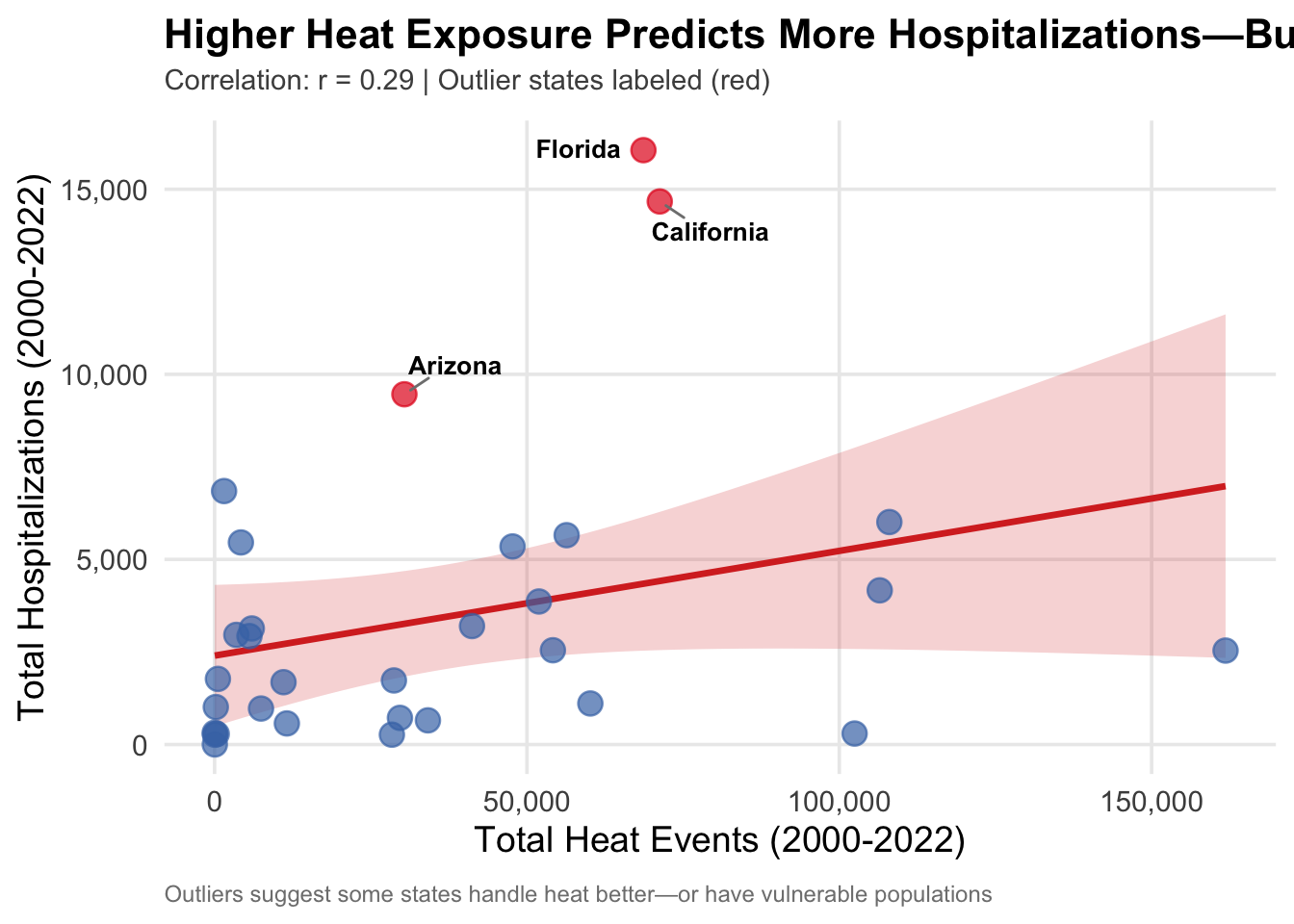 # State-level aggregatesscatter_data <- heat_events |>group_by(State) |>summarise(heat_events =sum(EHE)) |>left_join( hosp |>group_by(State) |>summarise(hospitalizations =sum(Hosps)),by ="State" ) |>filter(!is.na(hospitalizations))# Calculate correlationcor_value <-cor(scatter_data$heat_events, scatter_data$hospitalizations)# Fit linear model and identify outlierslm_model <-lm(hospitalizations ~ heat_events, data = scatter_data)scatter_data <- scatter_data |>mutate(predicted =predict(lm_model),residual = hospitalizations - predicted,is_outlier =abs(residual) >1.5*sd(residual) )ggplot(scatter_data, aes(x = heat_events, y = hospitalizations)) +geom_smooth(method ="lm", se =TRUE, color ="#d73027", fill ="#d73027", alpha =0.2, linewidth =1.2) +geom_point(aes(color = is_outlier), size =4, alpha =0.7) + ggrepel::geom_text_repel(data = scatter_data |>filter(is_outlier),aes(label = State),size =3.5,fontface ="bold",box.padding =0.5,point.padding =0.3,segment.color ="gray50",max.overlaps =15 ) +scale_color_manual(values =c("FALSE"="#4575b4", "TRUE"="#e31a1c"), guide ="none") +scale_x_continuous(labels = scales::comma) +scale_y_continuous(labels = scales::comma) +labs(title ="Higher Heat Exposure Predicts More Hospitalizations—But Not Always",subtitle =sprintf("Correlation: r = %.2f | Outlier states labeled (red)", cor_value),x ="Total Heat Events (2000-2022)",y ="Total Hospitalizations (2000-2022)",caption ="Outliers suggest some states handle heat better—or have vulnerable populations" ) +theme_minimal(base_size =14) +theme(plot.title =element_text(face ="bold", size =16, hjust =0, margin =margin(b =5)),plot.subtitle =element_text(size =11, hjust =0, color ="gray30", margin =margin(b =10)),panel.grid.minor =element_blank(),plot.caption =element_text(size =9, color ="gray50", hjust =0, margin =margin(t =10)) )