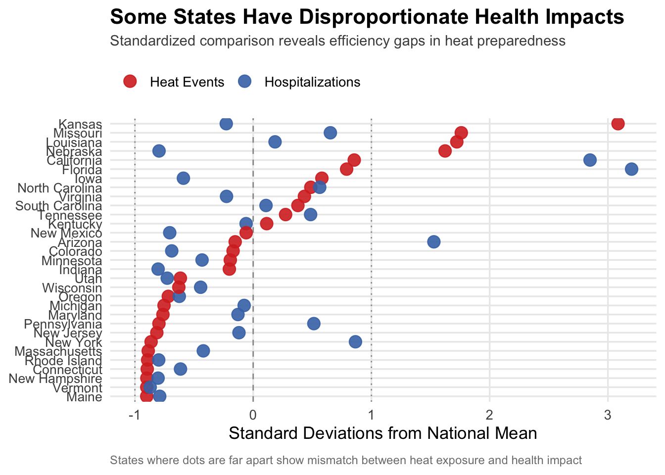 Kansas sits at an extreme, more than 3 standard deviations above average for heat events but only about 1.5 standard deviations above average for hospitalizations. This suggests Kansas may be better adapted to handle extreme heat, possibly through infrastructure, public awareness campaigns, or population demographics that are less vulnerable.